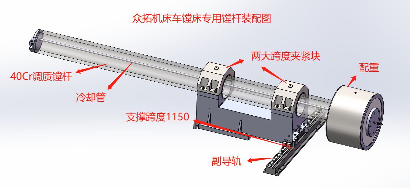 配置專用數(shù)控鏜桿和座,最大加工深度2000mm,鏜桿直徑Φ160mm、Φ260mm,鏜桿調(diào)質(zhì)到HRC38-42,材料40Cr,厚度不小于35mm,冷卻水管位于鏜桿內(nèi)側(cè)。刀架一端與中拖板連接,另一端為RGH55滾柱型高剛性直線導(dǎo)軌。
